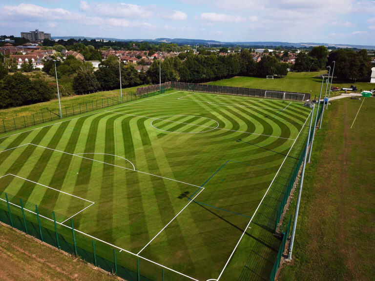 - Installation of the synthetic grass overlay is then undertaken, inlaid lines are cut and put in place.