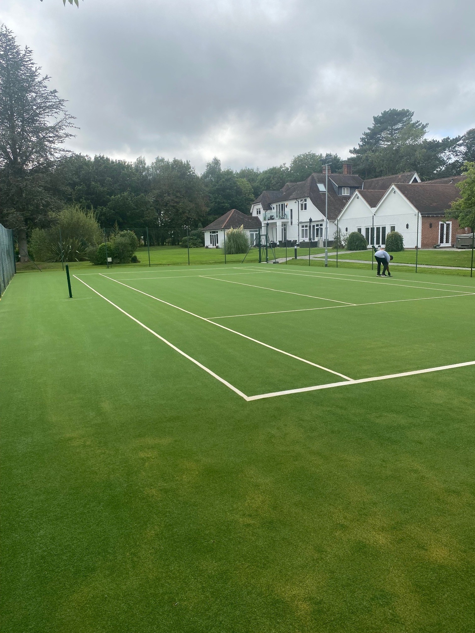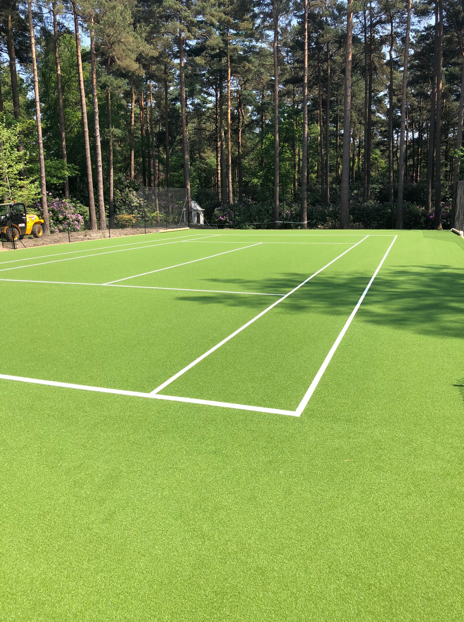 - Installation of the synthetic grass overlay is then undertaken, inlaid lines are cut and put in place.